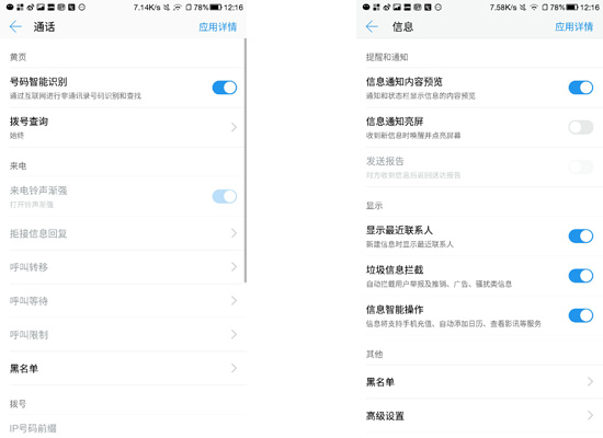 eui将系统设置和应用设置分开,可以单独对某个应用进行设置,这更加专业,以下便是针对通话和信息的设置,里面有骚扰拦截规则的制定以及通话黑名单的一些选项。